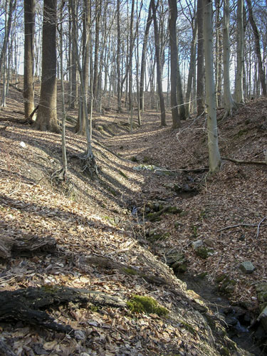 The map scale is 1:10.000 with 5m contour interval. Field checking was done in Fall 2013 by Marian Cotirta. A final pass was made in January and February 2014 to update rootstocks and dot knolls. Mapped terrain includes the Carpenter Recreation Area of White Clay Creek State Park and portions of the White Clay Creek Preserve. The White Clay Creek is designated as a National Wild & Scenic River.Rootstocks and dot knolls are the predominant point features at White Clay Creek. Almost all dot knolls on the maps started as rootstocks. The mapper has used several different symbols to denote rootstocks and dot knolls. The rootstock symbol is used for relatively recent fallen trees that have a vertical or nearly vertical root bulb. In some cases, a green vegetation line may be shown with the rootstock to show the associated tree. Where the root bulb has degraded to be more rounded and is mostly dirt, the dot knoll symbol is used. Dot knolls may also have the green vegetation line attached. Distinct fallen trees without an associated distinct rootstock or dot knoll are shown with only the green vegetation line. Generally, mapped rootstocks are at least 1m high with a few exceptions in some of the more open woods where rootstocks slightly less than 1m have been mapped. Mapped dot knolls are generally higher than 0.5 m.