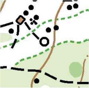 - The western edge of the map has a steep hillside that has parts mapped with contour lines, which arguably should be mapped as earthbanks.